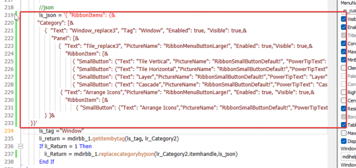 RibbonCategoryItem lr_Category2 Integer li_Return String ls_tag, ls_ json ls_tag ="Window" li_Return = mdirbb_1.getitembytag(ls_tag, lr_Category2) If li_Return = 1 Then li_Return = mdirbb_1.replacecategorybyjson(lr_Category2.itemhandle,ls_json) End If