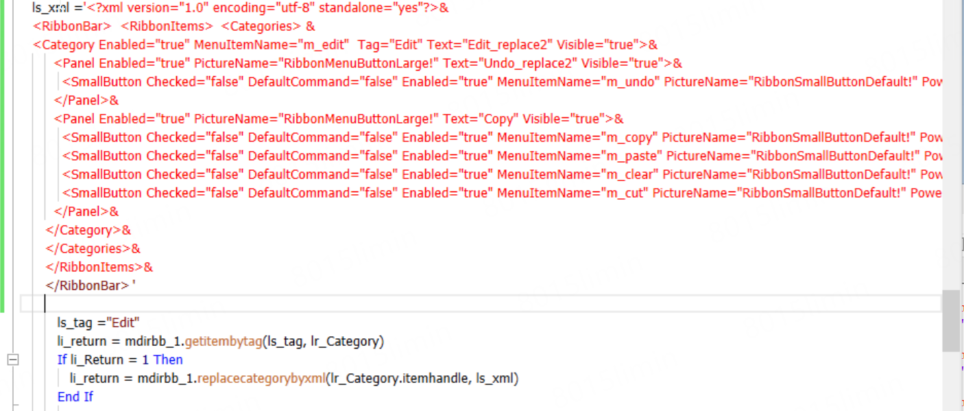 RibbonCategoryItem lr_Category Integer li_Return String ls_tag, ls_xml ls_tag ="Edit" li_Return = mdirbb_1.getitembytag(ls_tag, lr_Category) If li_Return = 1 Then li_Return = mdirbb_1.replacecategorybyxml(lr_Category.itemhandle, ls_xml) End If