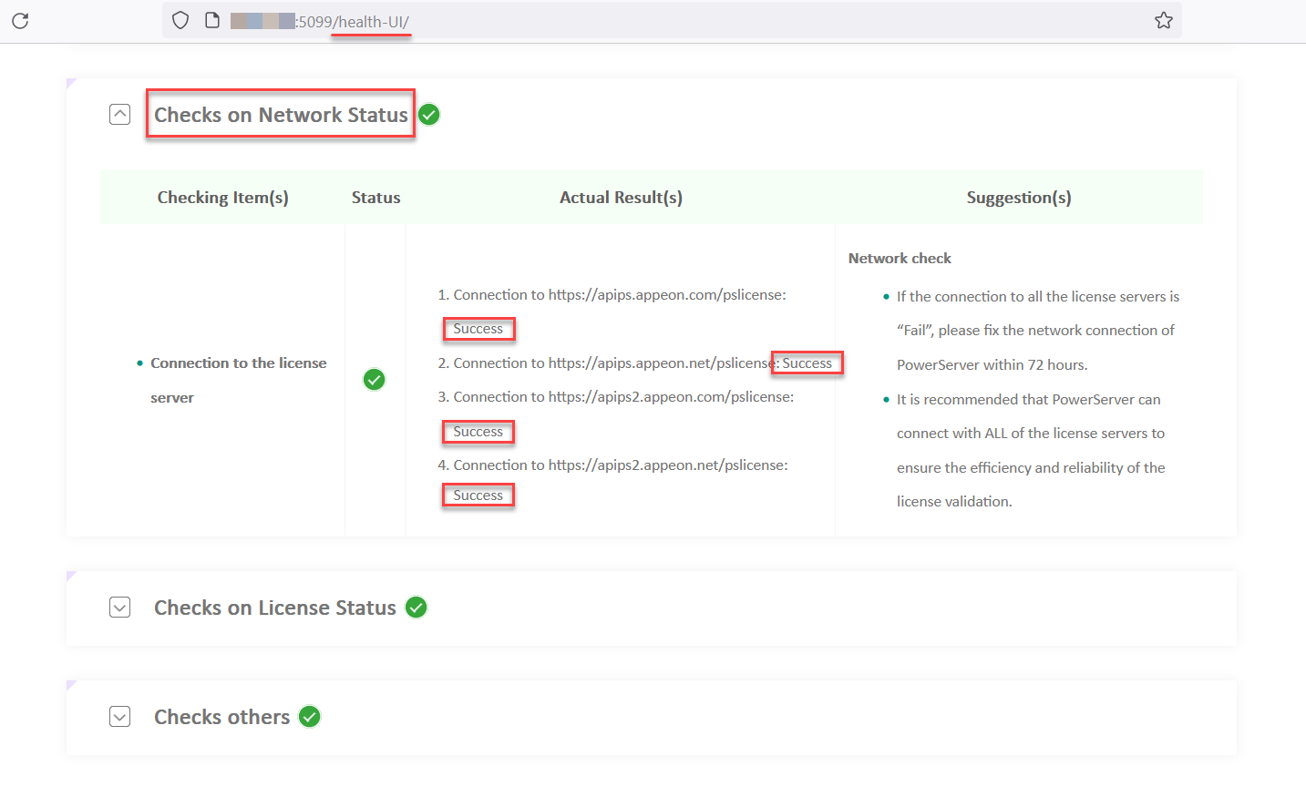 1) append "health-ui" at the end of the PowerServer Web API URL, for example, http://x.x.x.x:5099/health-ui/, and expand the "Checks on Network Status" category and make sure connection (from PowerServer) to the license servers is "Success".
