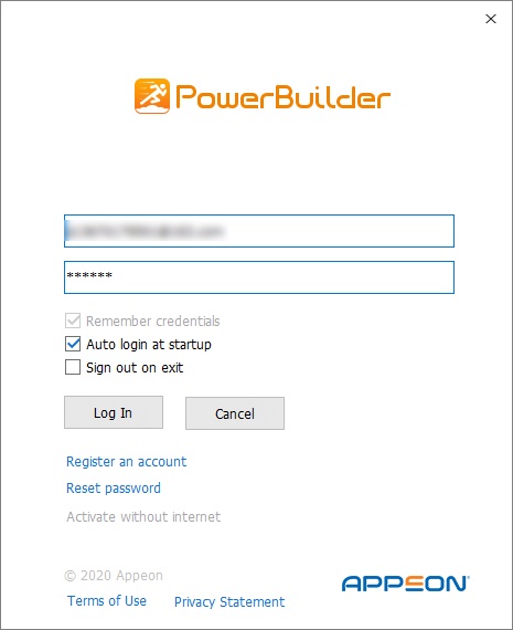 Click Log In. Your account will be validated and the associated license will be activated immediately by the Appeon license server.