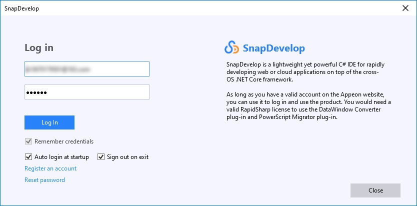 Launch the SnapDevelop IDE, and then enter the user account to log in and activate SnapDevelop.