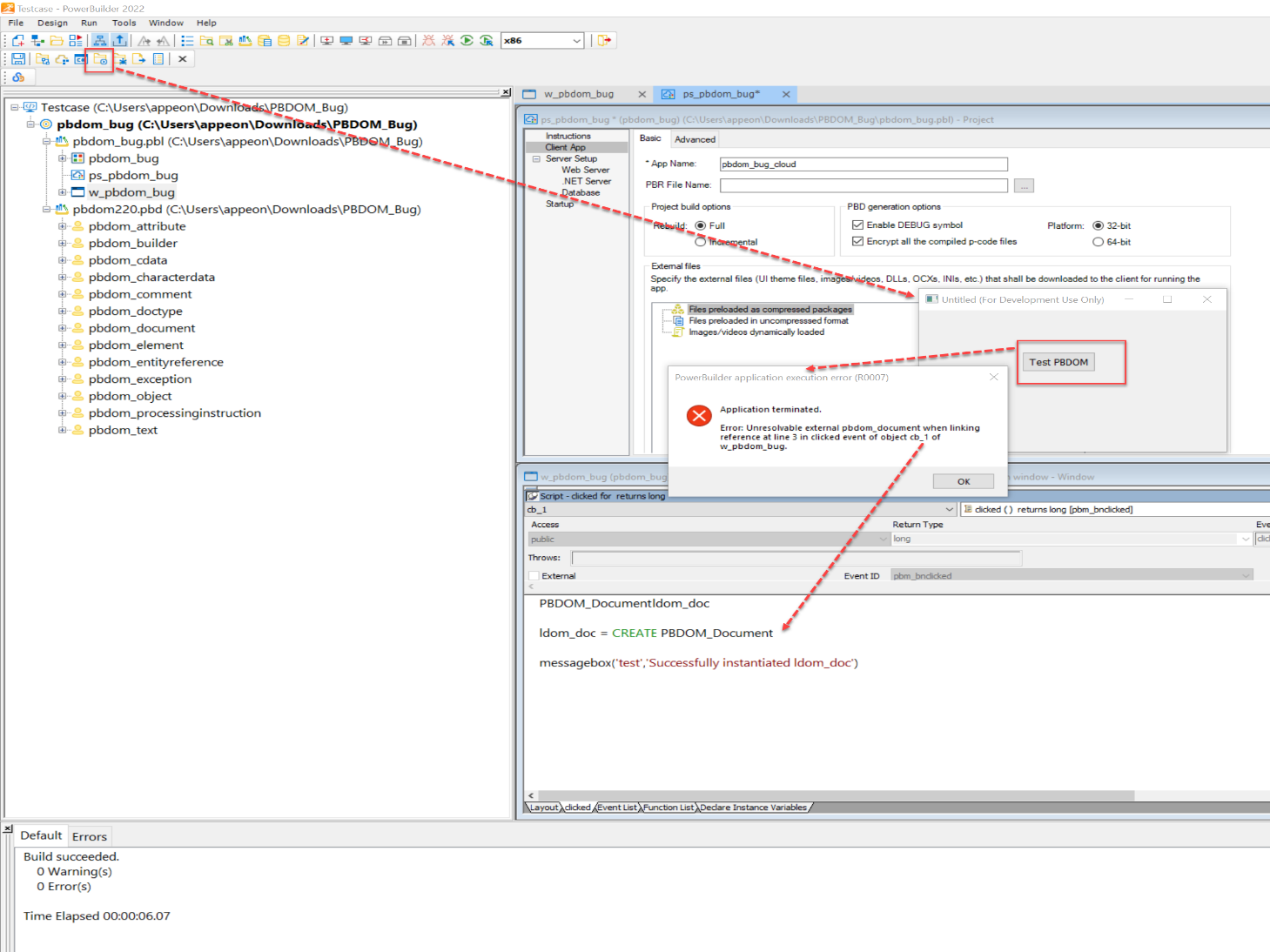 Application terminated. Error: Unresolvable external pbdom_document when linking reference at line 3 in clicked event of object cb_1 of w_pbdom_bug.