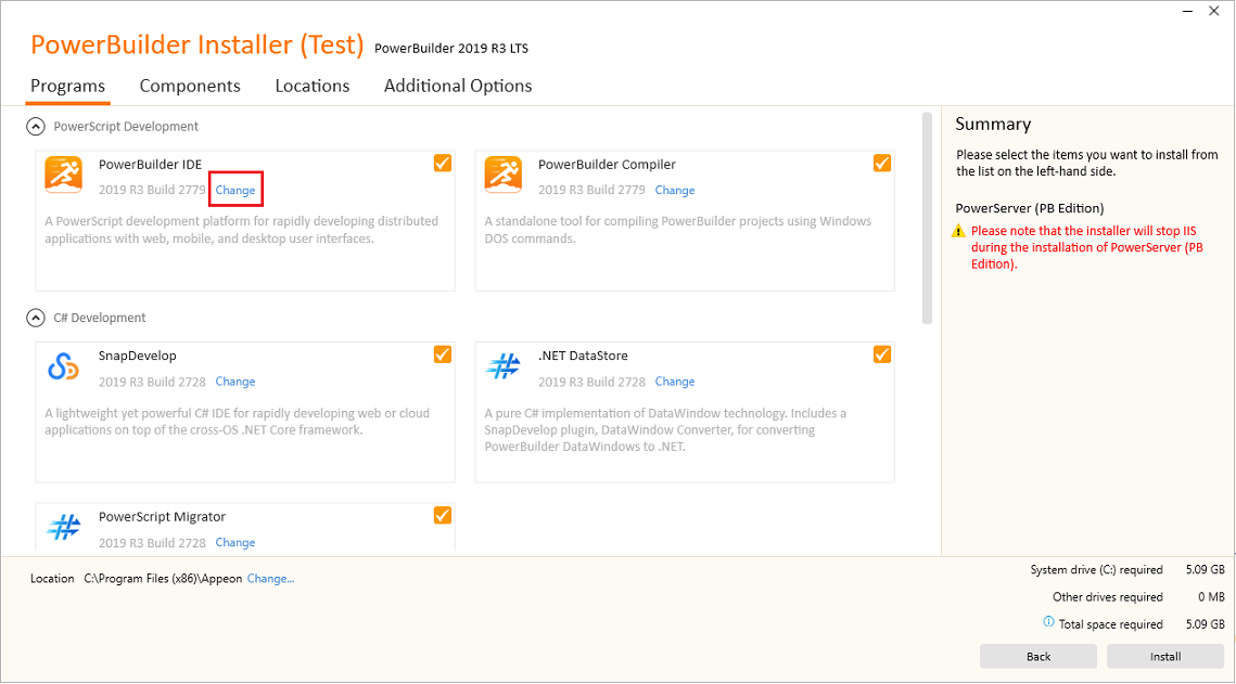 2. Click Change under the PowerBuilder IDE title from the Programs tab.
