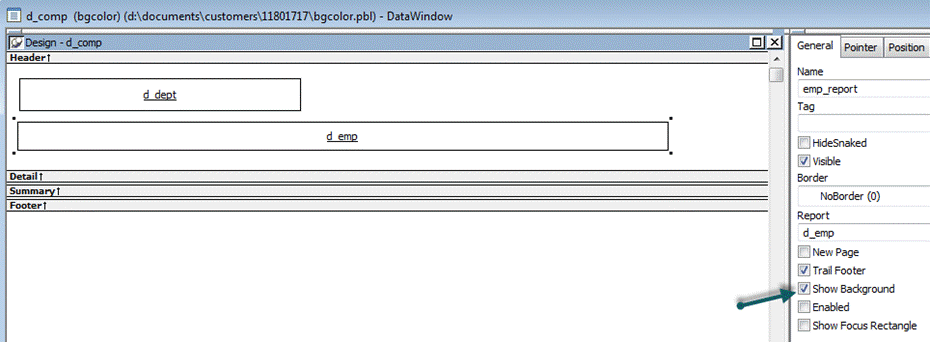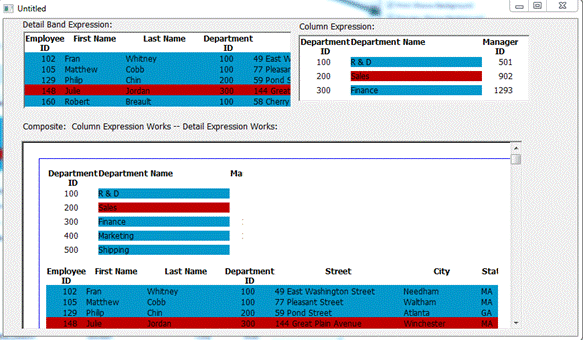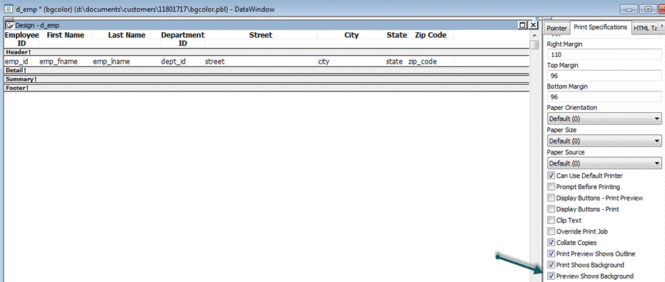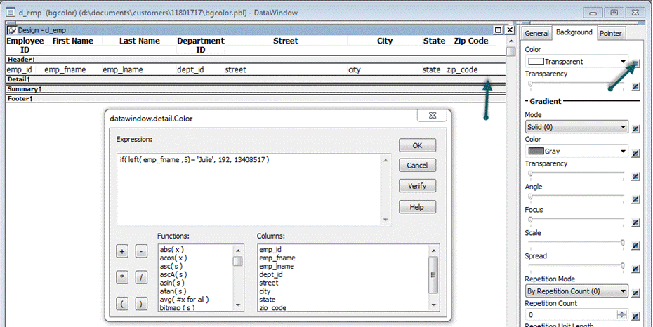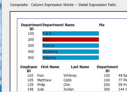 4. When the same DataWindow is put in as a report in composite DataWindow the background colors fail to display. The department DataWindow in the composite that works has a similar expression, but the expression is in the column and not the detail band.