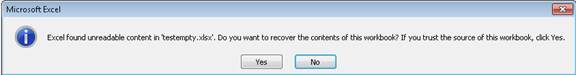 Cannot open the excel worksheet that is saved using SaveAs with the file format excel 12. When trying to open it, the below message prompts: