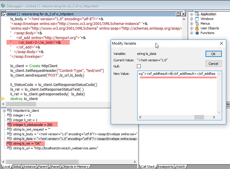 li_rtn = proxy_obj.of_add(2) //invoke Web service of_add method.