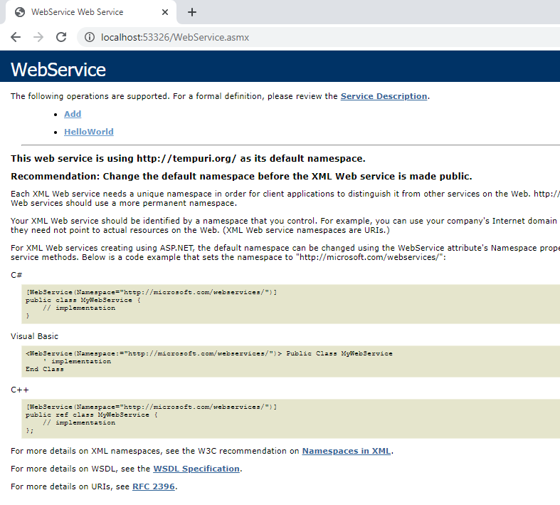 This sample Web Service has only two APIs. One is the HelloWorld method that returns a string and the other one is the Add method that has two int type input parameters and returns an int value.