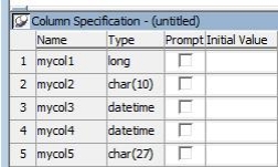 5. In the column specification view, notice that mycol2 is mapped to char(10) and mycol5 is mapped to char(27).