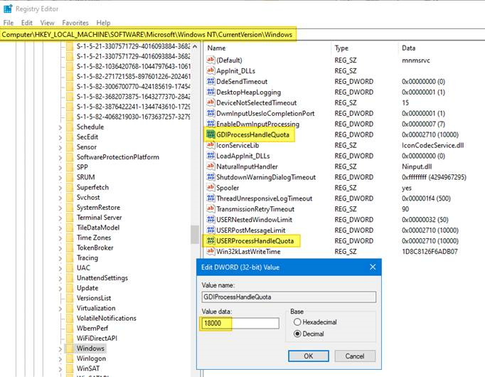HKEY_LOCAL_MACHINE\SOFTWARE\Microsoft\Windows NT\CurrentVersion\Windows\GDIProcessHandleQuota HKEY_LOCAL_MACHINE\SOFTWARE\Microsoft\Windows NT\CurrentVersion\Windows\USERProcessHandleQuota HKEY_LOCAL_MACHINE\SOFTWARE\WOW6432Node\Microsoft\Windows NT\CurrentVersion\Windows\GDIProcessHandleQuota HKEY_LOCAL_MACHINE\SOFTWARE\WOW6432Node\Microsoft\Windows NT\CurrentVersion\Windows\USERProcessHandleQuota