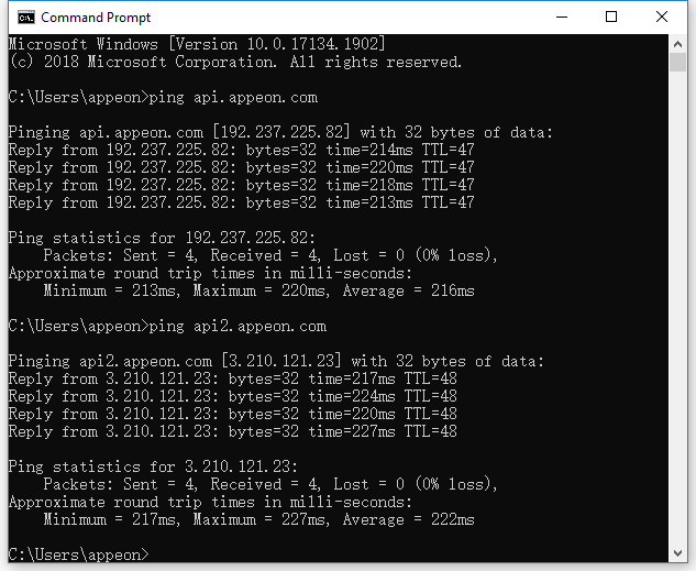 2. Try to ping api.appeon.com and api2.appeon.com in the Command Prompt and see if you can send and receive successfully.