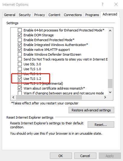 6. If TLS 1.2 is not enabled on the current machine. Please enable TLS 1.2 and then try to log into PowerBuilder/InfoMaker again.