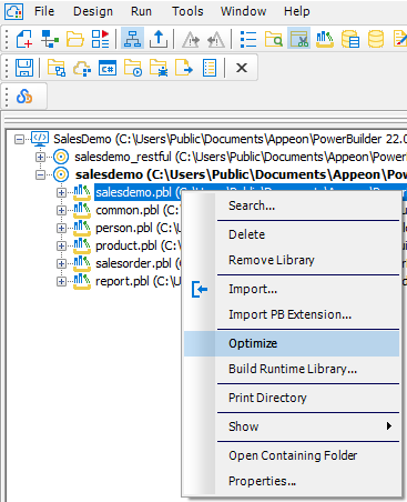 1. On the System Tree in PowerBuilder IDE, right- click on a PBL file, and select Optimize from the right-click menu.
