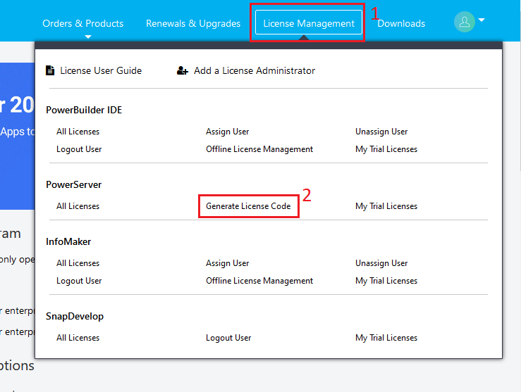 Note: If you do not see the "Generate License Code" option, this means your Appeon account does not own a PowerServer license.