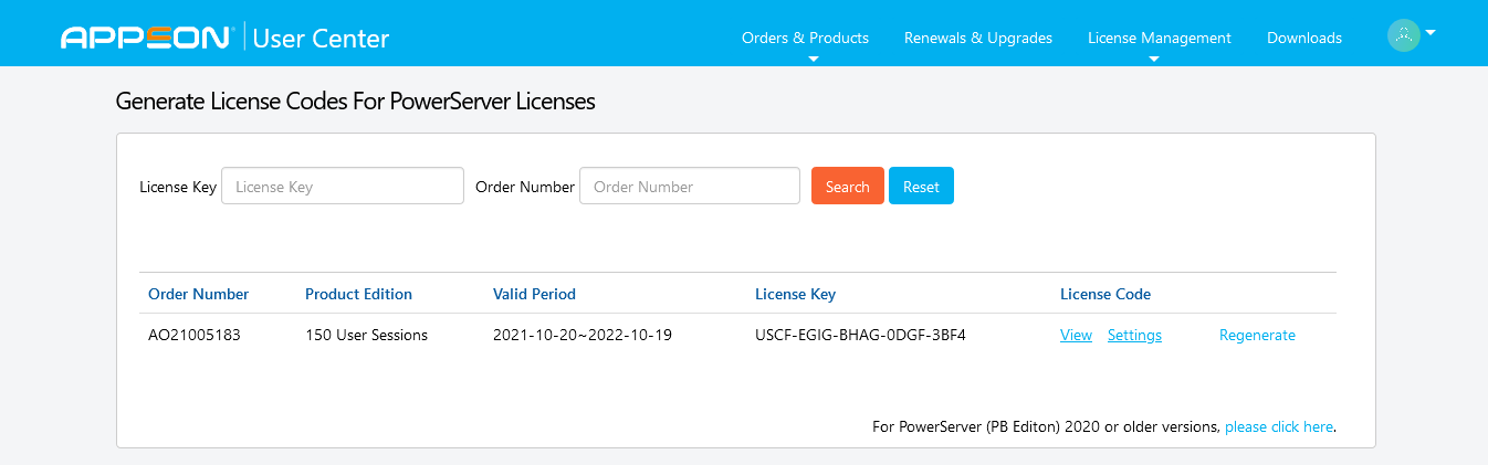 In this page, the Order Owner / License Administrator will be able to view all PowerServer licenses (production licenses and developer licenses) managed by them.