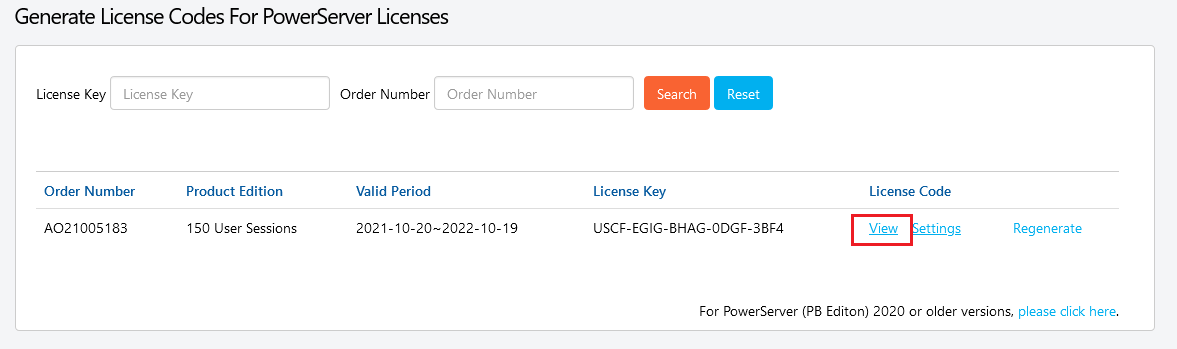 The production license of PowerServer will have a "View" option under the "License Code Column".