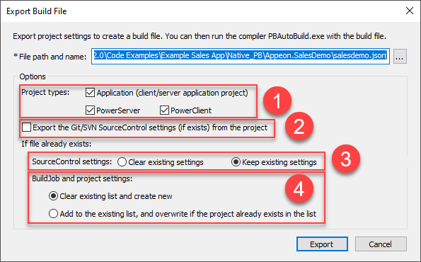 Specify how to overwrite the source code settings if the build file already contains such settings (③). Existing settings will be kept by default. If you want to export the current settings, such as login username, password (encrypted), source code path etc. to the build file, you should select "Clear existing settings". If you have selected "Clear existing settings", while have not selected "Export the Git/SVN SourceControl settings (if exists) from the project", then existing settings will be removed and no settings will be stored.