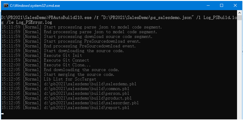 PBAutoBuild250.exe /f "D:\PB2025R2\SalesDemo\ps_salesdemo.json" /l Log_PSBuild.log /le Log_PSError.log /lu Log_PSUnsupport.log
