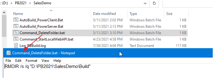 When the PBAutoBuild250.exe command is executed later, it will execute the commands in Command_DeleteFolder.bat before it downloads the source code.