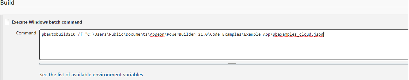 )The PBAutoBuild250 command can integrate with Jenkins to automate the build and deployment process for PowerServer projects. Refer to the Jenkins user documentations for how to use Jenkins.