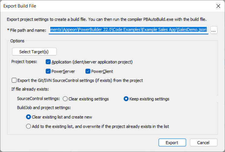 The build file and commands used in this guide can be downloaded from https://github.com/Appeon/PowerBuilder-AutoBuild-Sales-Example. After you download these files to D:\PB2025R2\SalesDemo\, you can follow the instructions in the readme file.