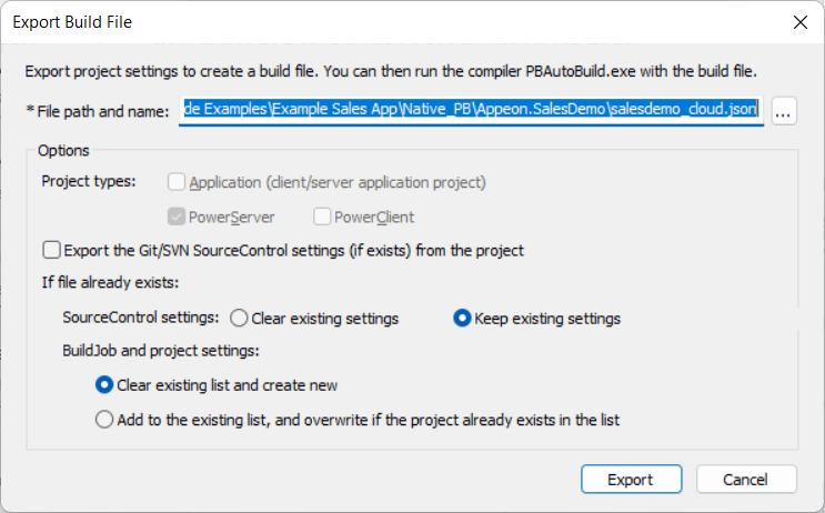 The exported build file contains all the settings required for building and deploying the PBL files of the application and some additional settings.
