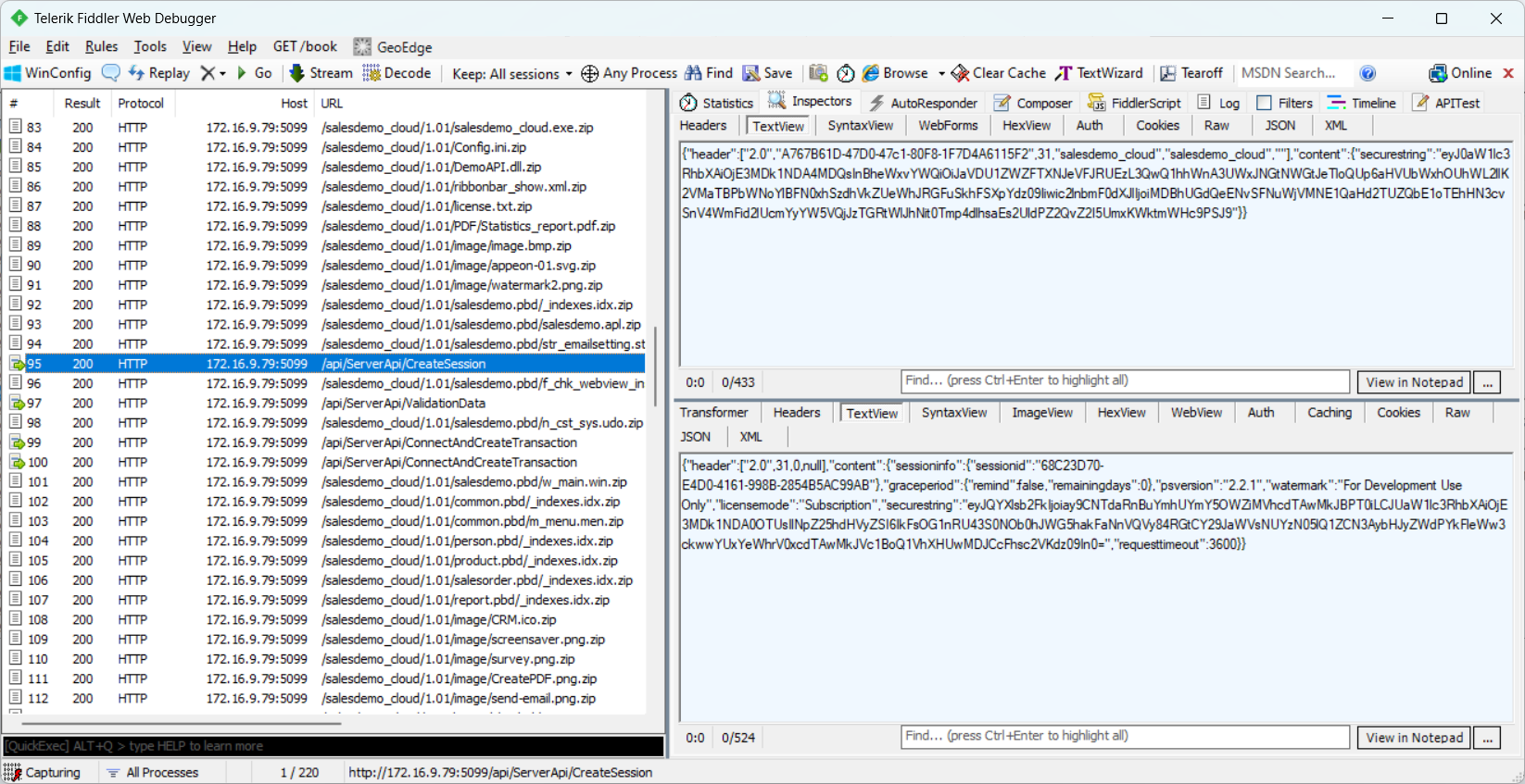 After selecting one of those sessions, click on Inspectors tab, then the TextView tab shows the request sent to the server and also the response returned from the server.