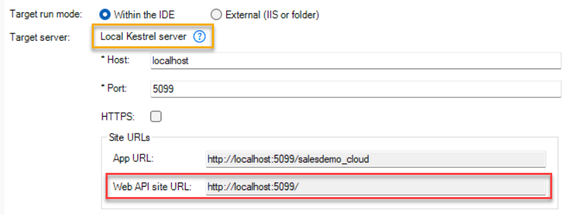 For Local Kestrel server, the Web API site URL is automatically generated based on the host name, port number, and connection method of the Kestrel server, for example, http://localhost:5099/.