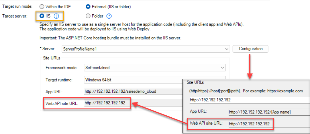 For IIS (local or remote), if you know where the Web APIs will be running, you can specify the site URL in the server profile; and the Web API site URL will be the same as the site URL, for example, http://localhost. If you are not sure where the Web APIs will be running, you can leave the site URL empty and specify the Web API URL later in the apprun.json file.