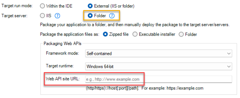 For Folder, if you know where the Web APIs will be running, you can specify the URL in the field; if you are not sure where the Web APIs will be running, you can leave the field empty and specify the URL later in the apprun.json file (Method 2).