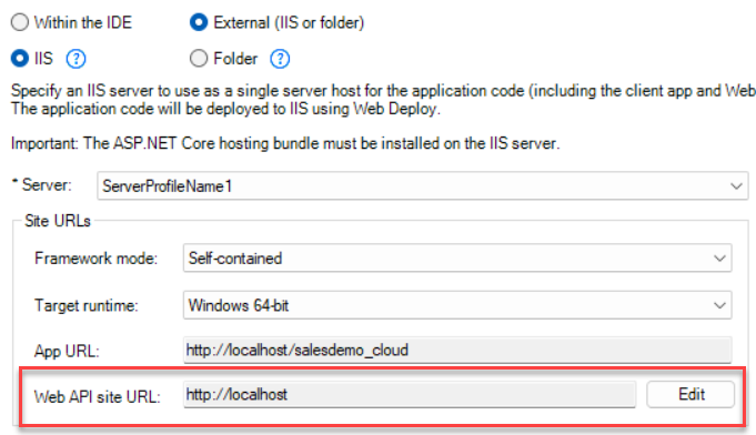 If you have configured or want to configure a different site for running the Web APIs, you can click Edit and then specify the site URL in this field. You will need to create the specified IIS site and deploy Web APIs to the site by yourself (you can run http://[Web-API-URL]/health-ui to verify Web APIs is running successfully). (View more)