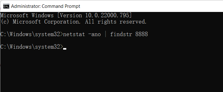 netstat -ano | findstr portnumberIf the command prompt returns no information, it means the port number is not occupied by any program, as shown in the figure below.