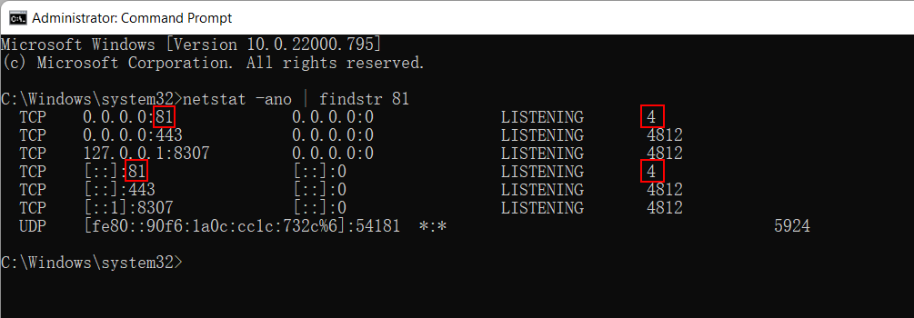 If the command prompt returns information, it means the port number is being used. For example, the process (whose PID is 4) is currently using the port number 81, as shown in the following figure. The last column shows the ID of the process that uses the port number.