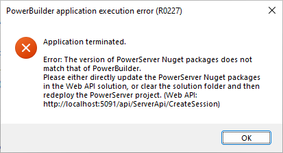When running the installable cloud application, the following error occurs: Application Terminated. The version of PowerServer Nuget packages does not match that of PowerBuilder.