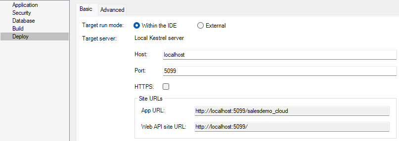 Specify the site URL. If you want to run the application from the Run Project button, you will need to specify the site URL, and make sure the URL points to where files will be deployed, for example, http://172.16.100.35:80.