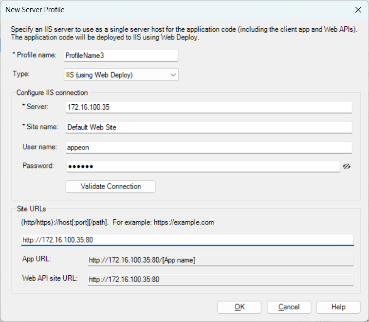 Server: The IP address or machine name of the IIS server. The port is by default 8172. If you have changed the port, specify the port here.