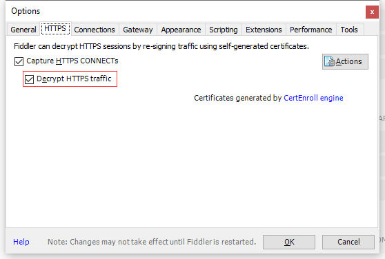By default, Fiddler does not capture and decrypt the secured HTTPS traffic. To capture data sent through HTTPS, the HTTPS traffic decryption must be enabled.