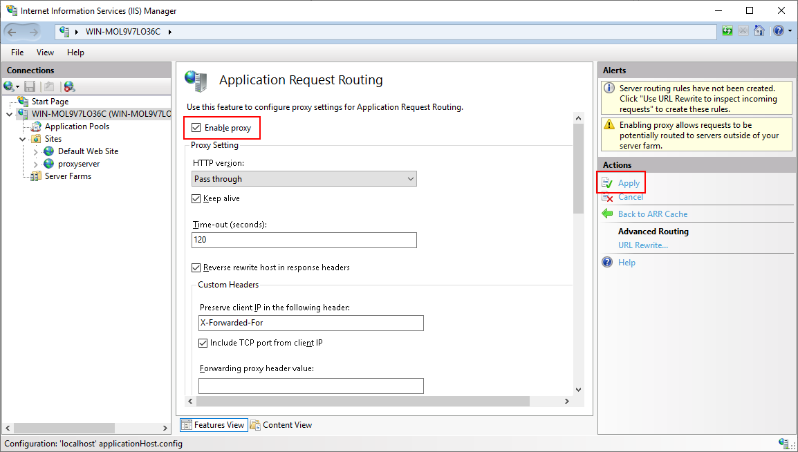 Step 3: On the Application Request Routing page, select Enable Proxy; and then in the Actions pane, click Apply. This enables ARR as a proxy at the server level.