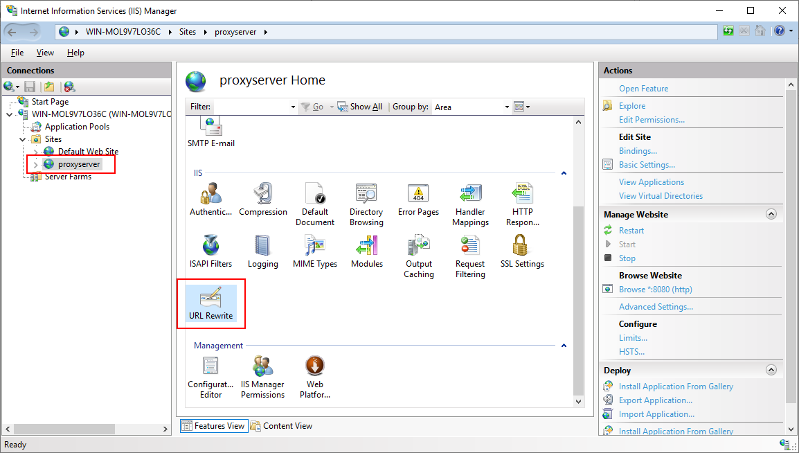 Step 4: Select the website (listening on port 8080 in this guide) in the Connections pane, and then double click URL Rewrite to open the feature.
