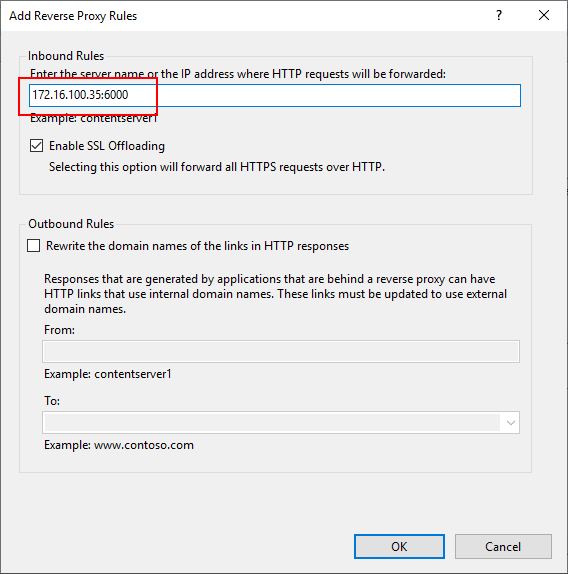 Step 7: In the Add Reverse Proxy Rules dialog, input the URL of the PowerServer Web API running on the Kestrel server (https://172.16.100.35:6000/ in this guide). Click OK.