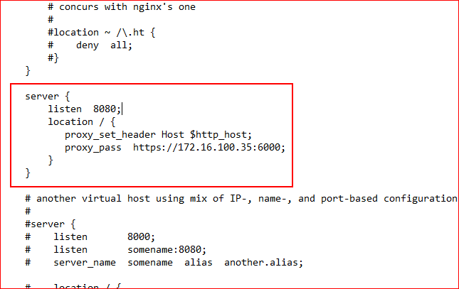 Step 2: Locate the "server" block and add another "server" block as shown below.