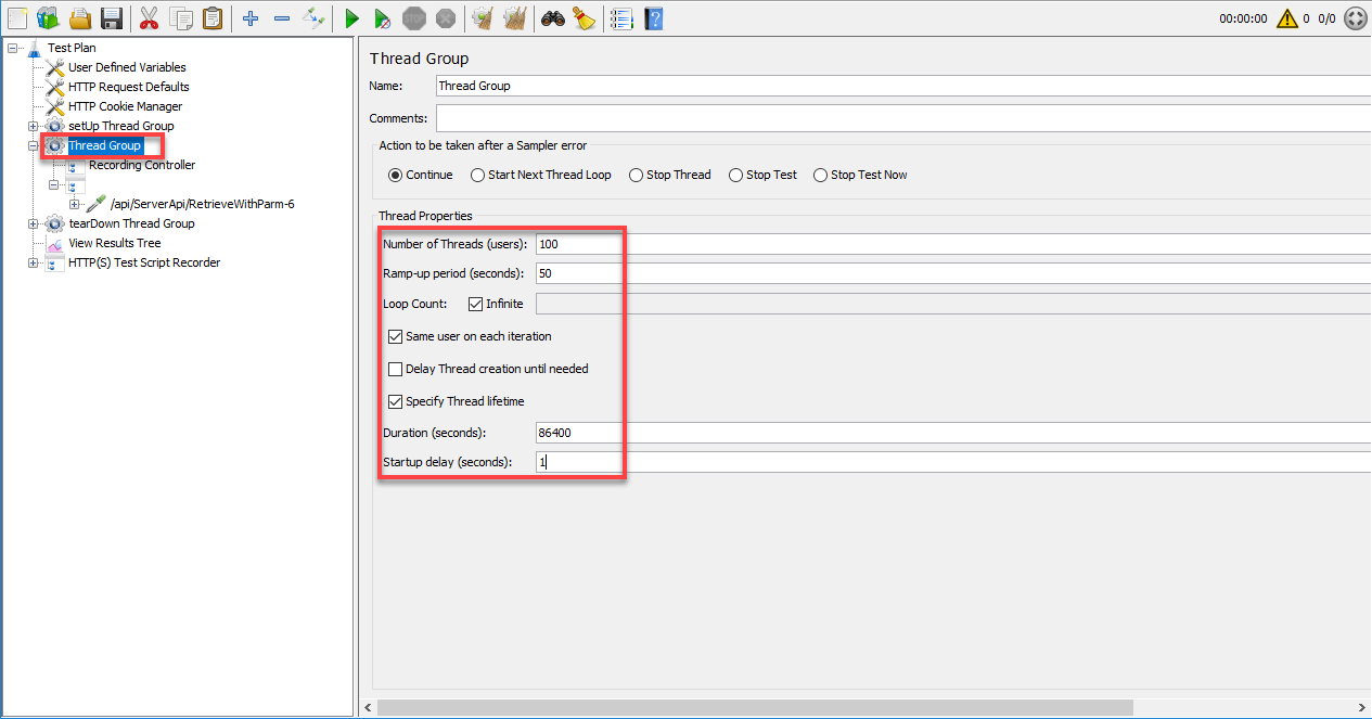 Select Thread Group and then specify the thread properties, for example, set the number of users to 100, ramp-up period to 50 seconds, which means 2 requests are made in every second (setting ramp-up to 0 will start all 100 users at one time); and set loop count to infinite and duration to 86400 seconds, which means the test will be run repeatedly in 24 hours.