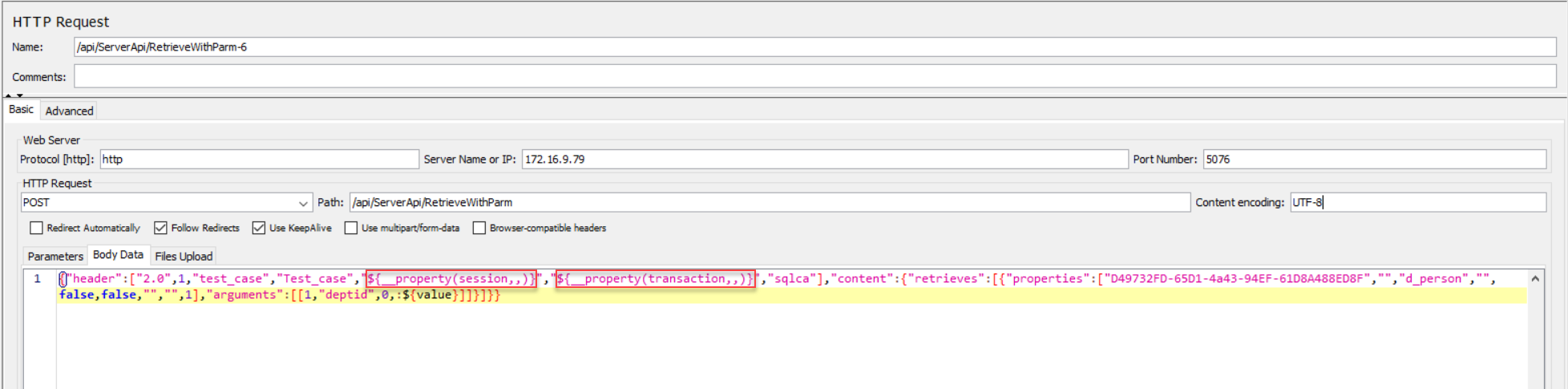 For example, go to the Body Data of the RetrieveWithParm request, and make sure the session ID and the transaction ID are replaced with the global property: