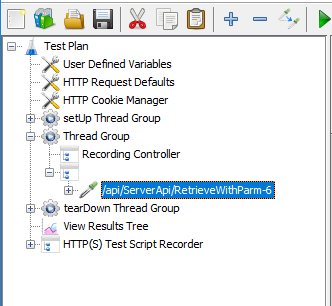 After moving requests to the setUp Thread Group and the tearDown Thread Group, now the regular Thread Group contains only the main requests, for example, the RetrieveWithParm request.