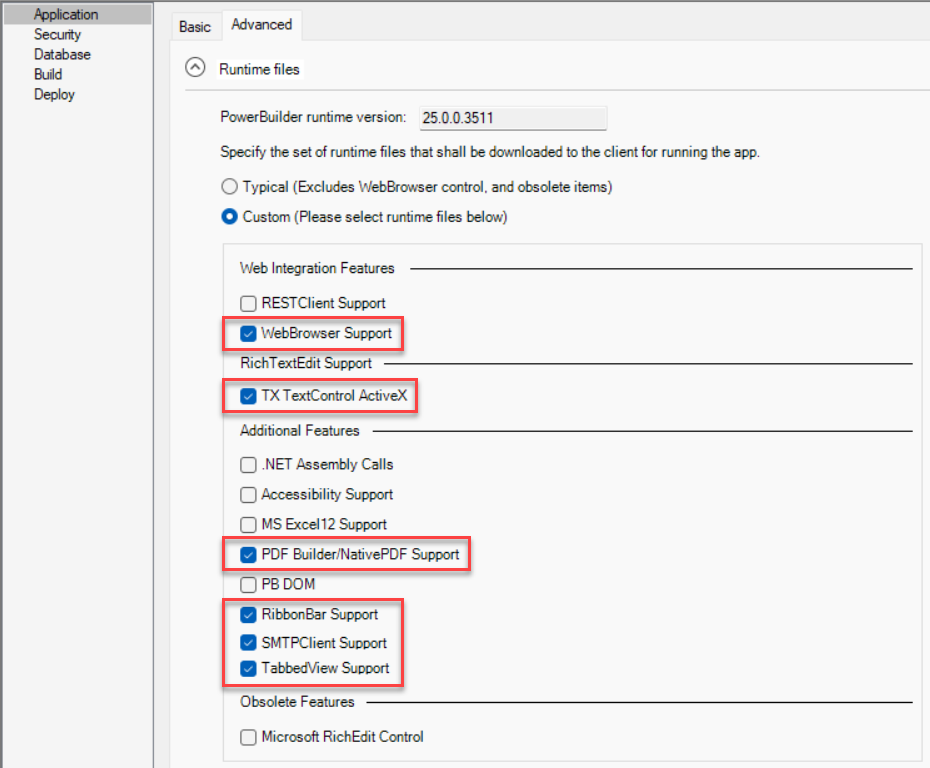 Step 5: Go to the Advanced tab, expand the Runtime files option group, select Custom, and then select the required runtime files.