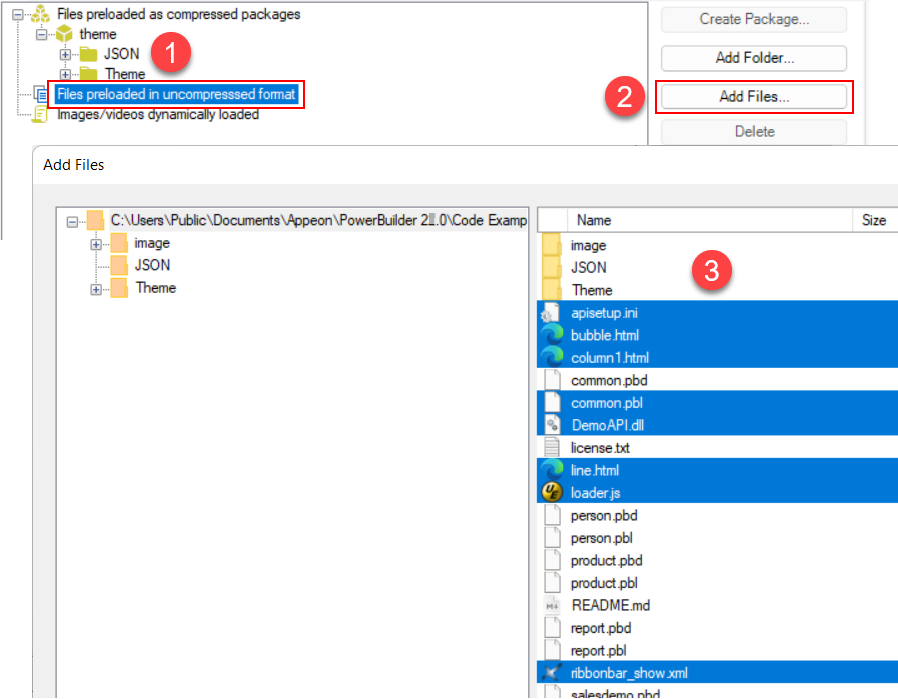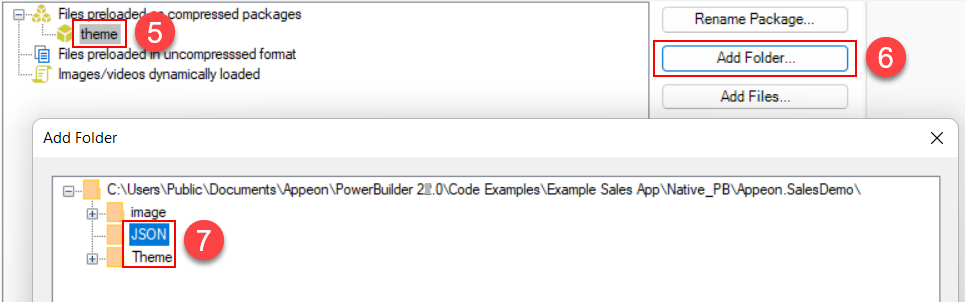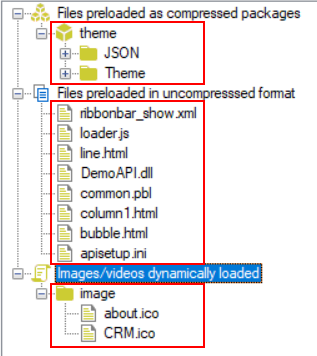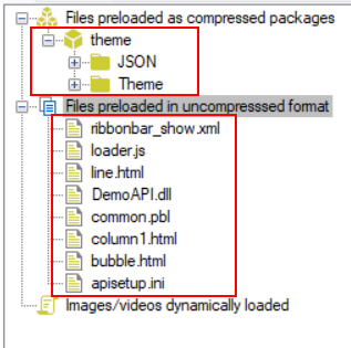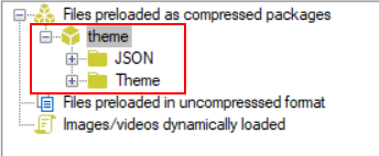 Step 2: In the External files option group, select Files preloaded as compressed packages and then click Create Package. Input a package name (for example "theme"). Then select this package and click Add Folder to add these two folders one by one: JSON and Theme, as shown in the figure below.