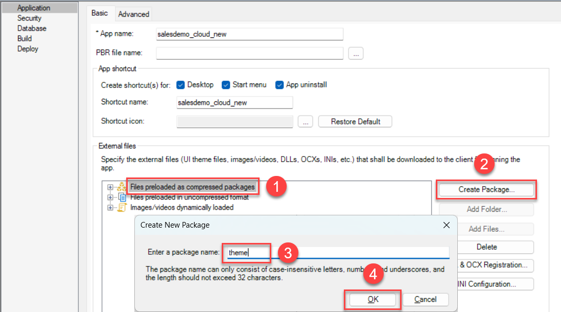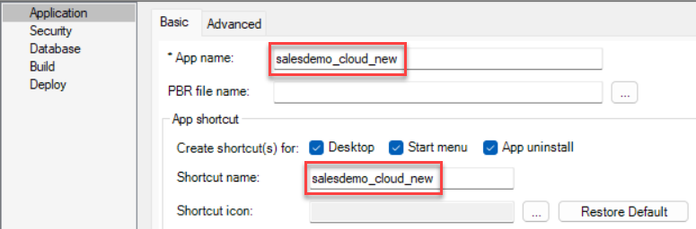 Step 1: In the PowerServer project painter, select the Application page > Basic tab, input "salesdemo_cloud_new" in App name and Shortcut name.