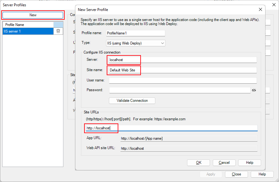 Step 4: In the New Server Profile dialog, specify a name for the profile in the Profile Name field, and then select IIS (using Web Deploy) from the Type list.