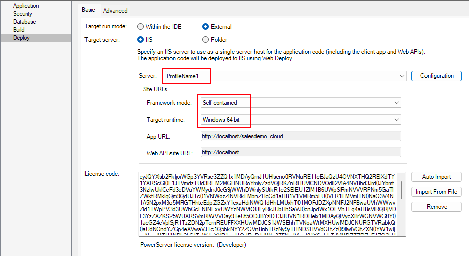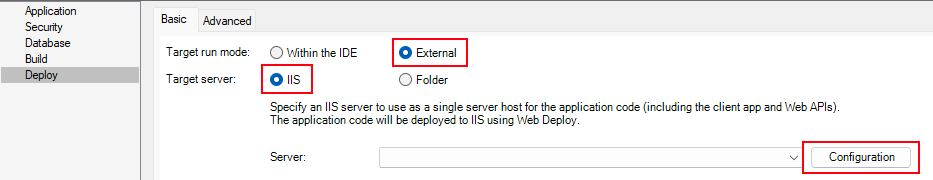 Step 2: Select External as the target run mode, select IIS as the target server, and then click the Configuration button.
