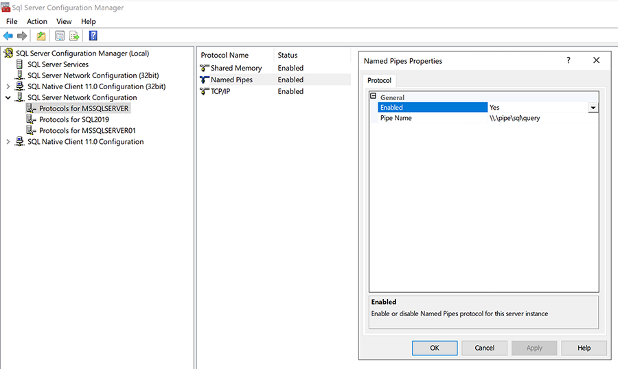 To configure the Named Pipes protocol on the SQL Server database server (using SQL Server 2019 on Windows Server 2019 64-bit as an example):