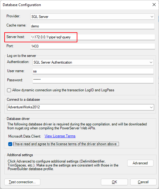 Data Source=np:\\172.0.0.1\pipe\sql\query;Initial Catalog=SnapTest;User ID=sa;Password=mypwd;